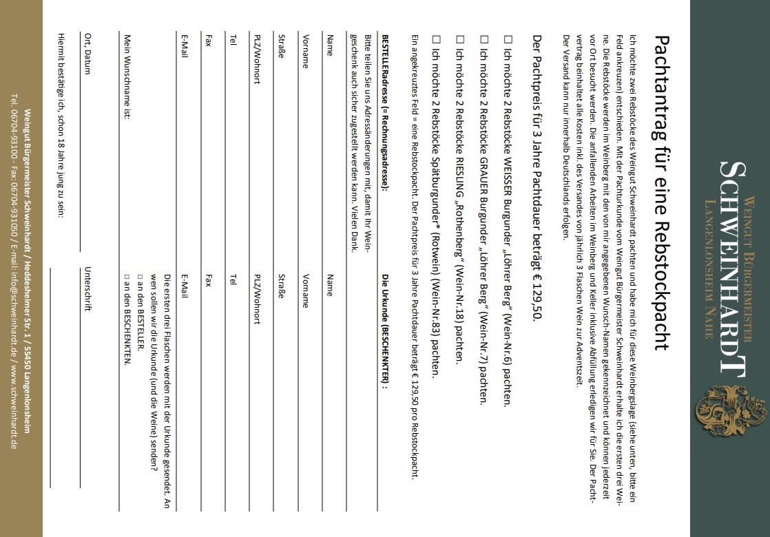 - Ihre Pacht-Urkunde. Bitte füllen Sie dafür den Pachtantrag aus, den wir Ihnen nach Ihrer Bestellung zusenden.